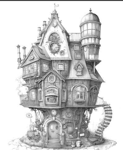 استمتع برحلة فريدة إلى عالم الخيال البخاري (Steampunk) مع صفحات التلوين الرقمية Tiny House!